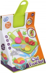 - Snijplank, mandje, snijbare wortel, tomaat, aardappel, ui, mes, schiller, prikker, lepel