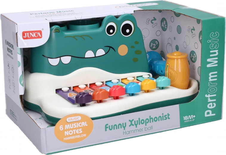 Ontdek een leuke en educatieve speelgoedset in de vorm van een krokodil-hamerspel, die ook als xylofoon dient, inclusief hamertje en drie balletjes. Afmeting 25x16x12 cm.