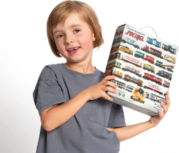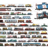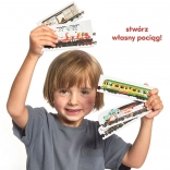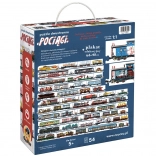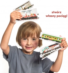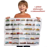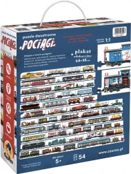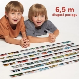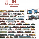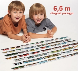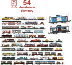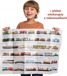 De set bevat 54 dubbelzijdige stukjes en een educatieve poster met interessante weetjes over techniek en de geschiedenis van transport. Kinderen en volwassenen kunnen zich onderdompelen in de wereld van het spoor en veel nieuws ontdekken.