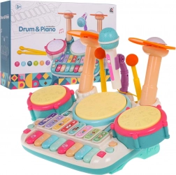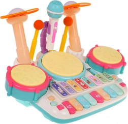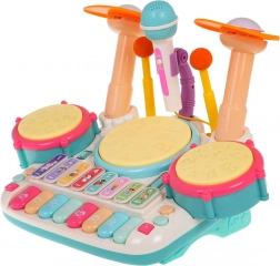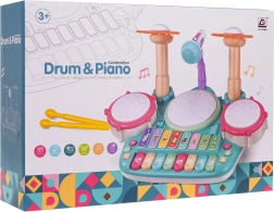 Interactieve muzieksset, piano met drums voor kinderen vanaf 3 jaar. Het muziekspeelgoed is gemaakt van hoogwaardig plastic in heldere kleuren en stimuleert het kind om te spelen en om te leren spelen op muziekinstrumenten. Het speelgoed combineert slagwerk en piano en is uitgerust met een microfoon en een geluidssysteem. De toetsen produceren geluiden van piano, trompet, gitaar, dierengeluiden en het uitspreken van cijfers. Drie trommels en bekkens lichten op bij elke slag met de stokjes. Er is ook een lesmodus, waarbij lampjes op de trommels oplichten (één licht, dubbel licht, drievoudig licht – met verschillende snelheden) en het kind ritmes leert tikken. Het muziekspeelgoed heeft volumeregeling en een ingang voor de microfoon, die deel uitmaakt van de set. Het speelgoed werkt op 4 AA 1,5 V-batterijen (niet inbegrepen). . Functies van de set: . - bedoeld voor kinderen vanaf 3 jaar, .- gemaakt van de hoogste kwaliteit plastic, .- geen scherpe randen, .- levendige kleuren die kinderogen aantrekken, .- verlichte trommels en bekkens, .- microfoon met geluidsversterking, .- speel- en leermodi, .- geluiden van piano, trompet, gitaar, dieren, cijfers, .- volumeregeling, .- microfooningang, . |