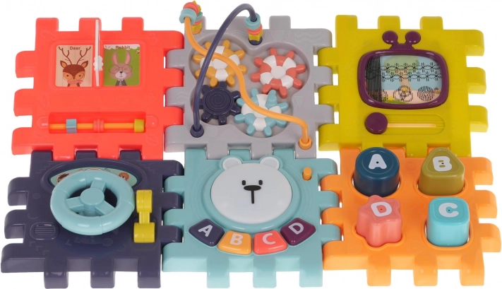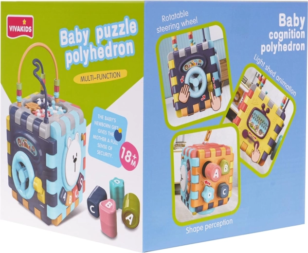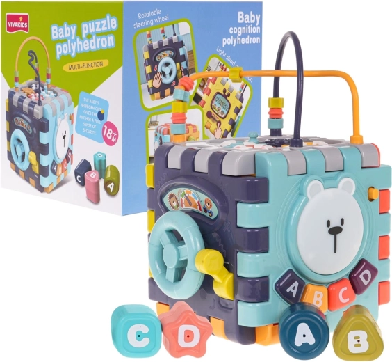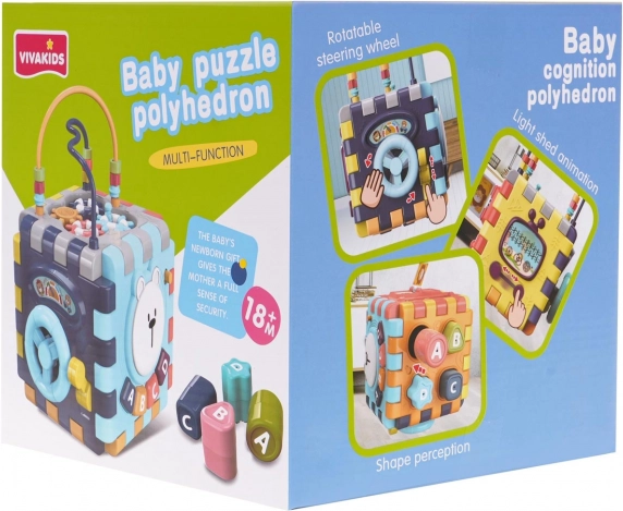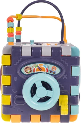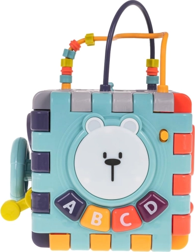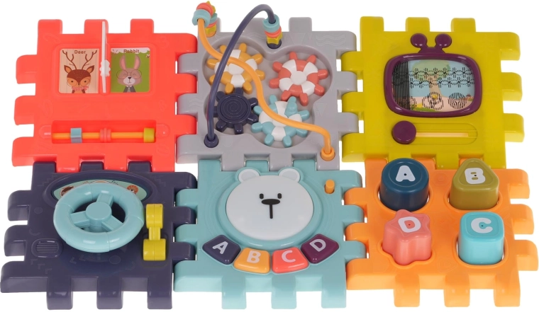 Deze slimme kinderkubus kan eenvoudig plat worden uitgeklapt, zodat het kind met afzonderlijke panelen apart kan spelen. De interactieve wand met het beertje trekt de aandacht met een lichtgevend hoofd en knoppen A, B, C, D die melodieën afspelen en letters in het Engels leren. Verder zijn er een stuur met “schakelaar”, sliders, draaielementen en een klein draaiboekje.
