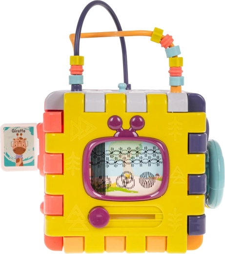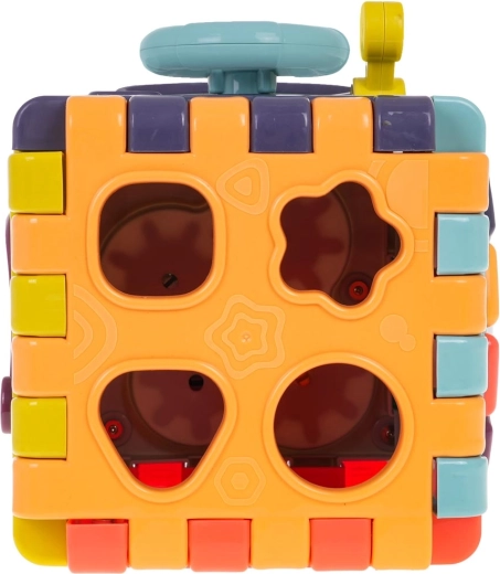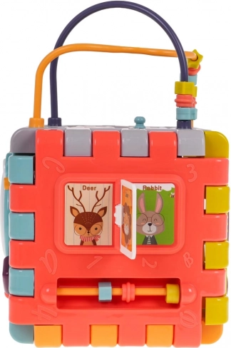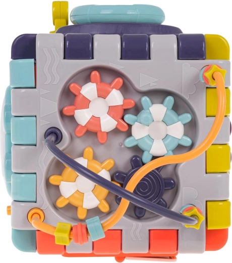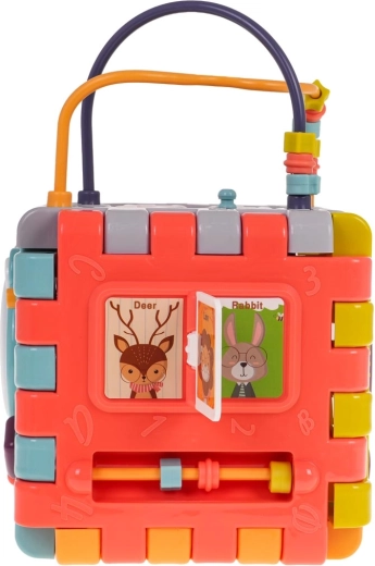 De bovenkant biedt tandwielen en kralen om de oog-handcoördinatie te oefenen. De vormsorter met 4 gekleurde blokjes ondersteunt het herkennen van vormen en logisch denken. De kubus is gemaakt van duurzaam plastic in levendige kleuren en nodigt uit tot ontdekken en zelfstandig spel.