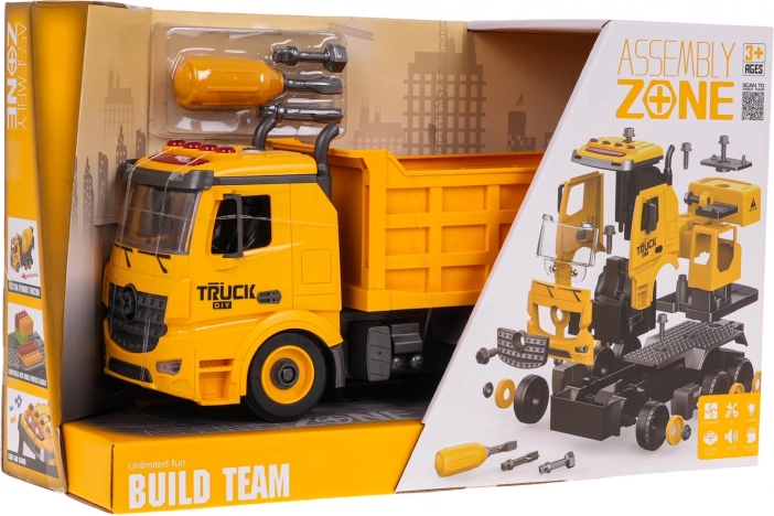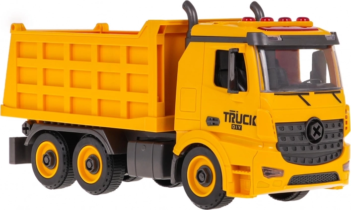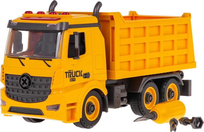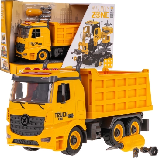 Leuk en leerzaam speelgoed voor kleine bouwers: een demonteerbare kiepwagen voor kinderen vanaf 3 jaar met licht- en geluidseffecten. Inclusief schroevendraaier met verwisselbare bits, waarmee het kind de fijne motoriek traint en montageprincipes leert. De kiepwagen heeft voorwielaandrijving, een heffende laadbak met te openen achterklep en op het dak knipperende lampjes en functionele knoppen voor start-, achteruitrij-, claxon- en alarmgeluiden. Batterijen 3× AG13 zijn inbegrepen.