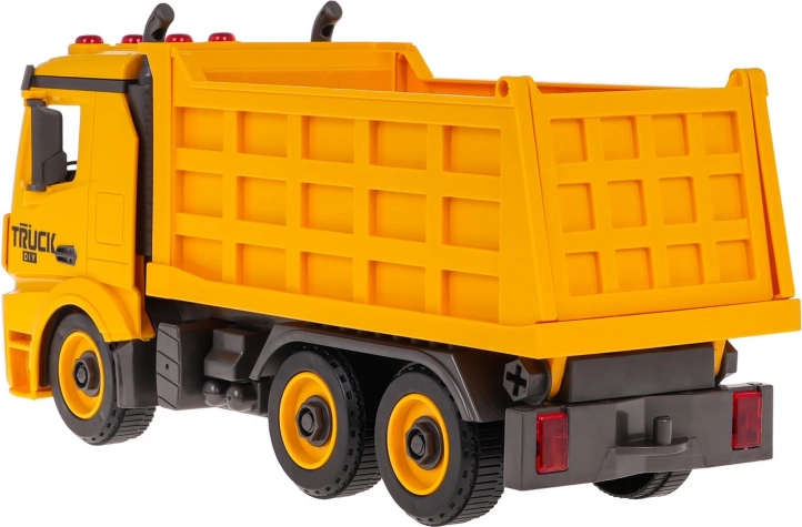 Praktische functies omvatten een heffende en neerlatende laadbak met te openen achterklep en de mogelijkheid om de aanhanger/laadbak los te koppelen van het chassis. Op de cabine zitten knipperende lampjes en bedieningsknoppen voor start-, achteruitrij-, claxon- en alarmgeluiden. Speelklaar direct na het uitpakken – batterijen zijn inbegrepen.