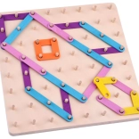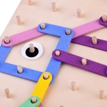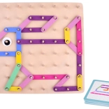 Gekleurde stokjes van verschillende lengtes worden op het bord met pinnetjes gelegd volgens voorbeelden of eigen ideeën. Geweldige training van fijne motoriek en ruimtelijk inzicht.
