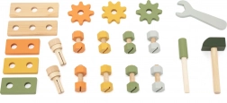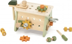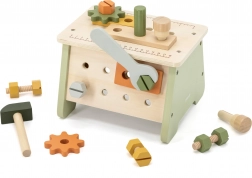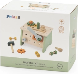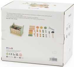 De houten set Viga PolarB mini werkbank 2-in-1 zal elke kleine klusser blij maken. Bevat 21 onderdelen, waaronder een hamer, sleutel, schroevendraaier, schroeven en moeren, pennen en tandwielen. De tafel kan worden omgedraaid en verandert dan in een praktische transport- en opbergkist. Spel stimuleert op natuurlijke wijze de fijne motoriek, creativiteit en verbeeldingskracht.
