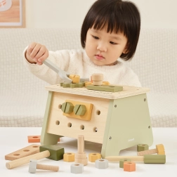 Ontdek het slimme speelgoed dat een mini werkbank en gereedschapskist 2-in-1 combineert. Kinderen maken kennis met gereedschap en oefenen schroeven, hamerslagen en precies verbinden. Na het omdraaien van de tafel ontstaat een compacte box voor het eenvoudig opbergen en meenemen van alle onderdelen.