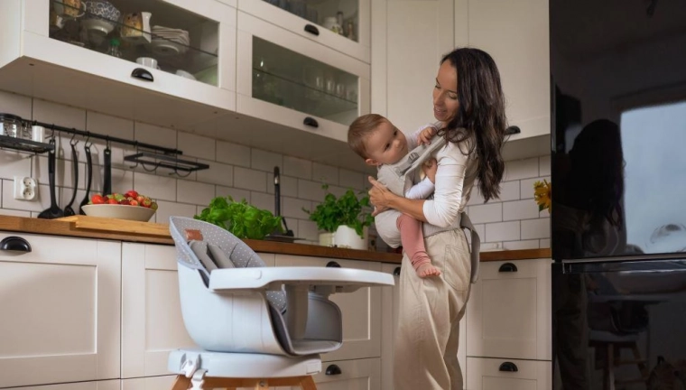 Het brede, verstelbare paneel houdt de rug van de baby in de juiste bolling en zorgt voor de ergonomische M-positie van de beentjes voor een veilige heupontwikkeling.