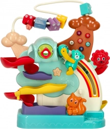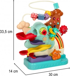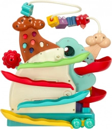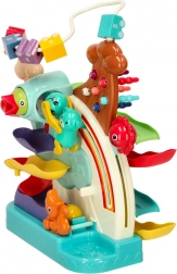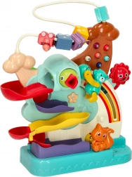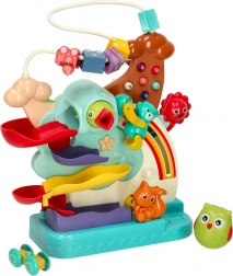 Heldere kleuren en de vloeiende beweging van de knikkers versterken de visuele waarneming, terwijl de bediening van de elementen de fijne motoriek verfijnt. Tegelijkertijd maakt het kind op speelse wijze kennis met cijfers en leert het causale verbanden begrijpen.