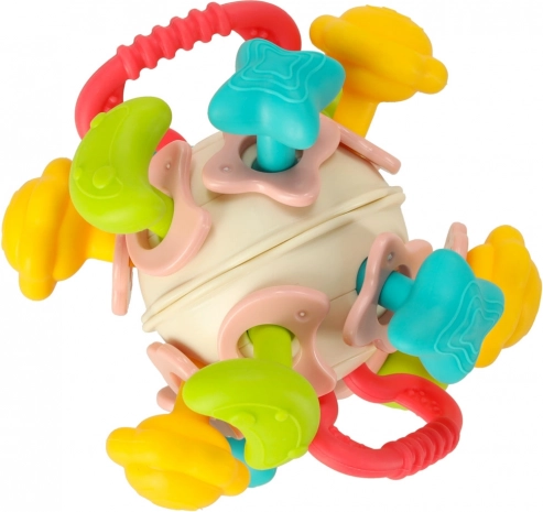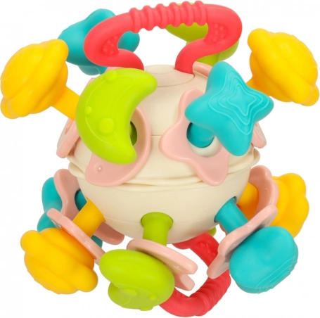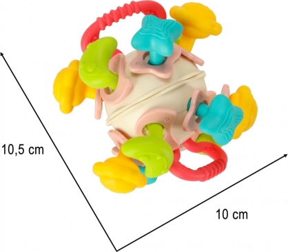De siliconen delen functioneren als een veilige bijtring die verlichting biedt aan gevoelig tandvlees. De bal motiveert kinderen om te grijpen, te draaien en van hand tot hand over te geven, wat bijdraagt aan de ontwikkeling van de fijne motoriek en de oog-handcoördinatie.