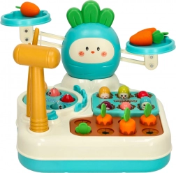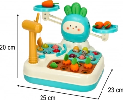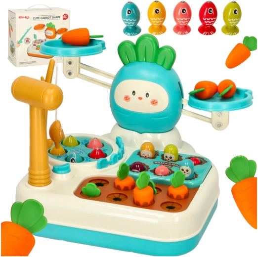 Deze kleurrijke, multifunctionele set biedt kinderen wel vier verschillende activiteiten in één. Met het hamertje, het hengeltje, de worteltjes en de weegschaal leren kinderen balans en gewichtsvergelijking, trainen ze reactievermogen en oefenen ze geduld en nauwkeurigheid.