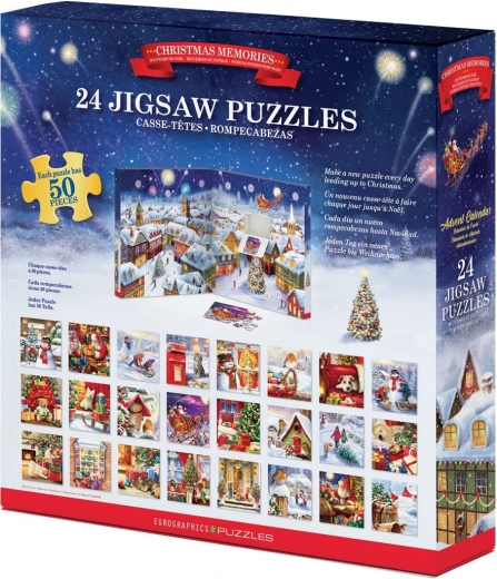 Maak het aftellen naar kerstavond leuker met deze originele adventskalender van EUROGRAPHICS. Je vindt erin 24 verschillende puzzelafbeeldingen met kerstmotieven, elk met 50 stukjes, in een vierkant formaat van 12,5 × 12,5 cm. De kalender heeft 24 venstertjes, is herbruikbaar en in elk venstertje zit een voorbeeld van de te leggen afbeelding.