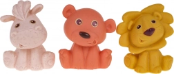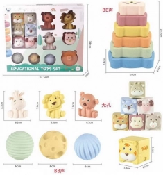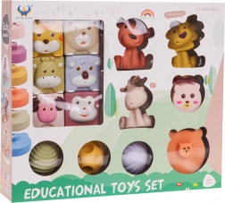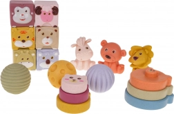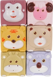 - 6 blokken met dieren: aap, schaap, tijger, beer, hert, koala, elk met een andere textuur en kleur.