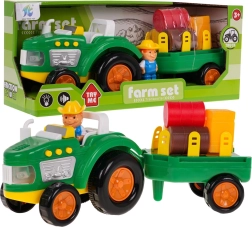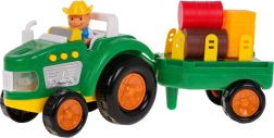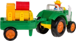 Prikkel de verbeelding van kinderen met een kleurrijke, interactieve tractor met afkoppelbare aanhanger. Deze tractor is uitgerust met geluidseffecten, zoals startgeluiden, motorgeluiden en claxon, evenals lichteffecten in de vorm van knipperende koplampen. De set bevat een boerfiguurtje en diverse pakken en blokken stro voor nog meer boerderijsfeer.