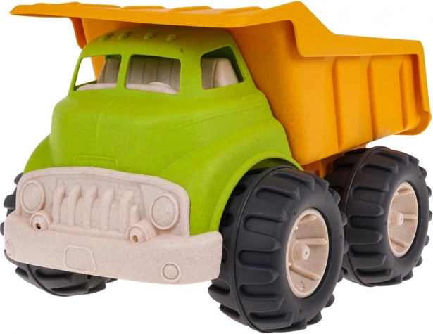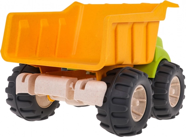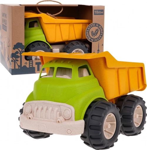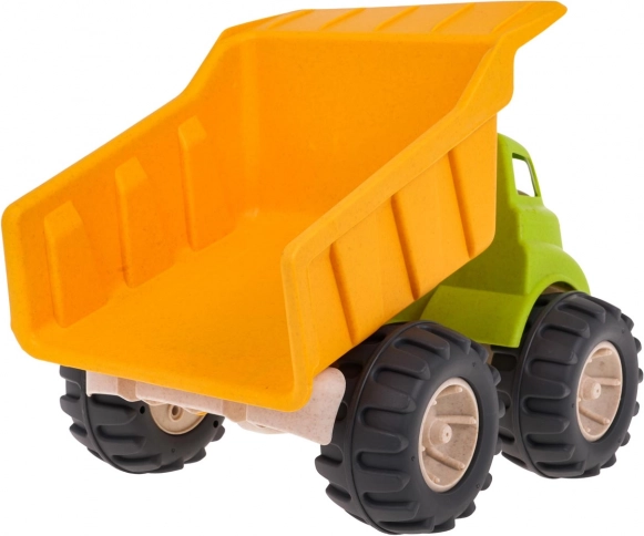 De kiepwagen is gemaakt van bioplastic, wat zowel milieuvriendelijk als veilig voor kinderen is.