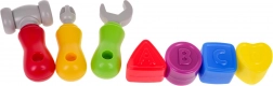 Onder het blad is een open lade waar kinderen hun gereedschap en blokken in verschillende letter- en vormvormen kunnen opbergen. De werkbank werkt op drie AG13-batterijen die bij de verpakking inbegrepen zijn.