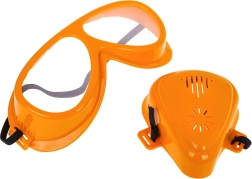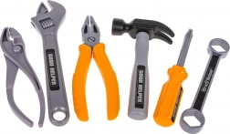 Schroevendraaier, hamer, sleutels, tangen, veiligheidsbril en masker, houten latjes en bevestigingsmateriaal. Alles voor creatief bouwen en het trainen van de fijne motoriek.