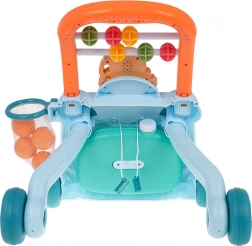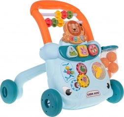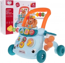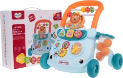De multifunctionele loopwagen en loopauto in blauwe uitvoering begeleidt kinderen veilig en speels bij hun eerste stapjes. De robuuste basis kan voor extra stabiliteit worden verzwaard met water of zand, de wielen hebben een rubberen loopvlak en een brede wielbasis voor stabieler sturen. Het interactieve paneel stimuleert de fijne motoriek, het logisch denken en het tijdsbesef dankzij de klok met bewegende wijzers, tandwielen en het kralenlabyrint.