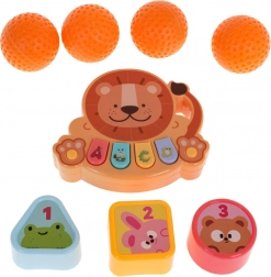 Bovenaan vind je een vormensorter (3 vormen), een telraam met 6 kralen en een afneembaar pianootje met dierengeluiden en melodieën. Aan de zijkant zit een praktisch mandje voor ballen en in de verpakking vind je 4 ballen voor extra spel en het oefenen van gooien.