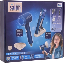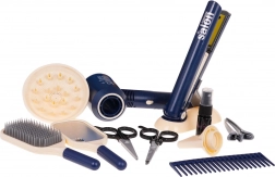 | De set is uitgerust met speciale uitrusting. . | Interactieve, goed uitgeruste kappersset met een föhn met verwisselbare opzetstukken en een batterij-gevoede stijltang, bedoeld voor kinderen vanaf 3 jaar. De set bevat een breed scala aan kappershulpmiddelen, waaronder een föhn, stijltang, schaar, kammen en andere accessoires. De haardroger blaast lucht. Hij heeft twee standen voor de luchtstroom en maakt tijdens het drogen geluiden zoals een echte. De stijltang heeft lichteffecten en geluiden die het stijlen van het haar begeleiden. De föhn werkt op 3 AAA 1,5 V-batterijen (niet inbegrepen), de stijltang op 2 AAA 1,5 V-batterijen (niet inbegrepen). .. Functies van de set: . - geschikt voor kinderen ouder dan 3 jaar, .- gemaakt van materialen van de hoogste kwaliteit, .- föhn met verwisselbare opzetstukken (diffuser en concentrator-opzetstuk), .- de föhn blaast lucht, .- de föhn heeft twee standen voor de luchtstroom, .- de föhn maakt geluiden tijdens het drogen, .- de stijltang heeft een schuif voor openen en sluiten, .- de stijltang heeft licht, .- de stijltang maakt geluiden die kenmerkend zijn voor het steilen van haar, .- praktische standaard voor föhn of stijltang. . |