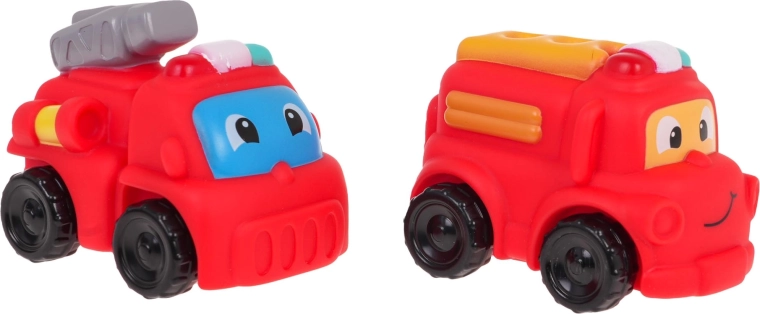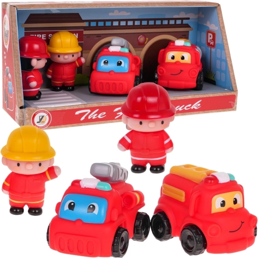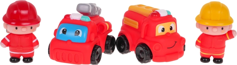 Kleurrijke set voor kleine brandweerlieden met 2 brandweerfiguurtjes en 2 schattige brandweerauto’s met rammelaars. Ideaal voor kinderlijke verbeelding en rollenspel, uitgevoerd in levendige kleuren en geschikt voor kinderen vanaf 3 jaar. De figuurtjes hebben draaibare hoofdjes en één autootje en het figuurtje met de gele helm bevatten een rammelaar voor nog meer speelplezier.