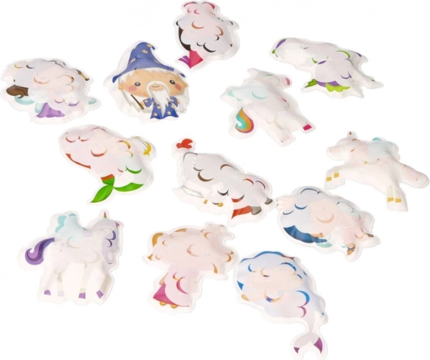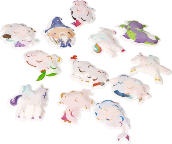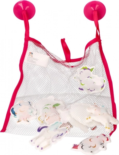 De set vrolijke schuimstickers met eenhoorns, tovenaars en wolkjes brengt veel fantasie in bad. Bij contact met water veranderen de stickers van kleur en ze hechten perfect op gladde, natte oppervlakken (bad, tegels). Na het spelen berg je ze eenvoudig op in het ademende net met zuignappen, dat zorgt voor snel uitlekken en drogen.