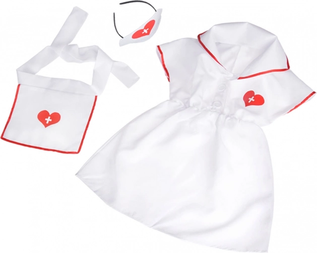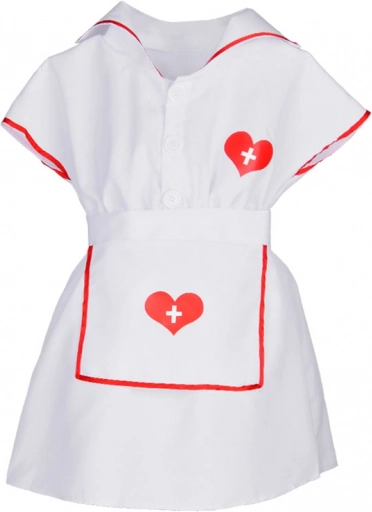 De witte jurk met rode biezen, hartjes met kruis en het schortje creëren de klassieke verpleegsterslook waar kinderen dol op zijn.