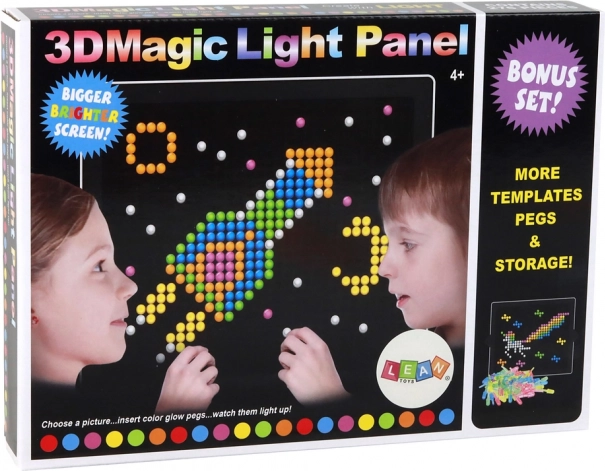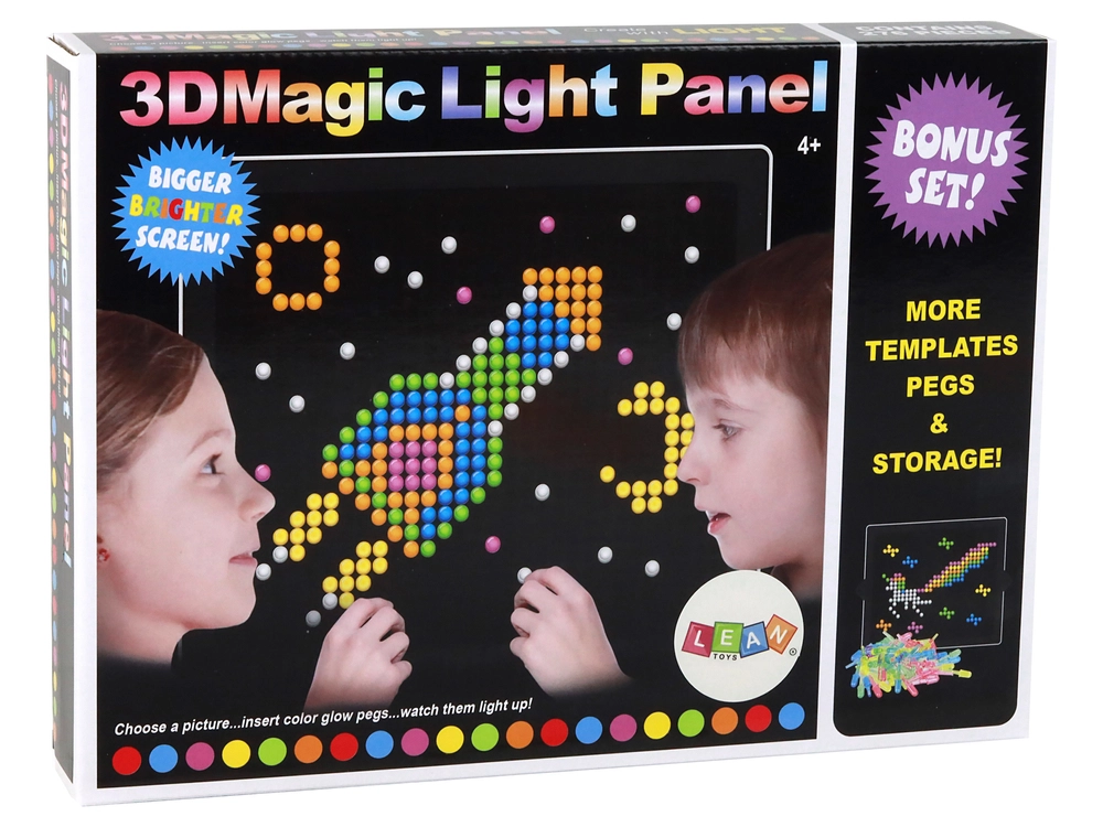 Ontdek creatieve pret met de magische verlichte 3D-plaat en een set van 276 kleurrijke pinnetjes. Maak lichtgevende afbeeldingen en 3D-patronen en ontwikkel fijne motoriek, ruimtelijk inzicht en creativiteit. Geschikt voor kinderen vanaf 4 jaar, met sjablonen voor een makkelijke start.