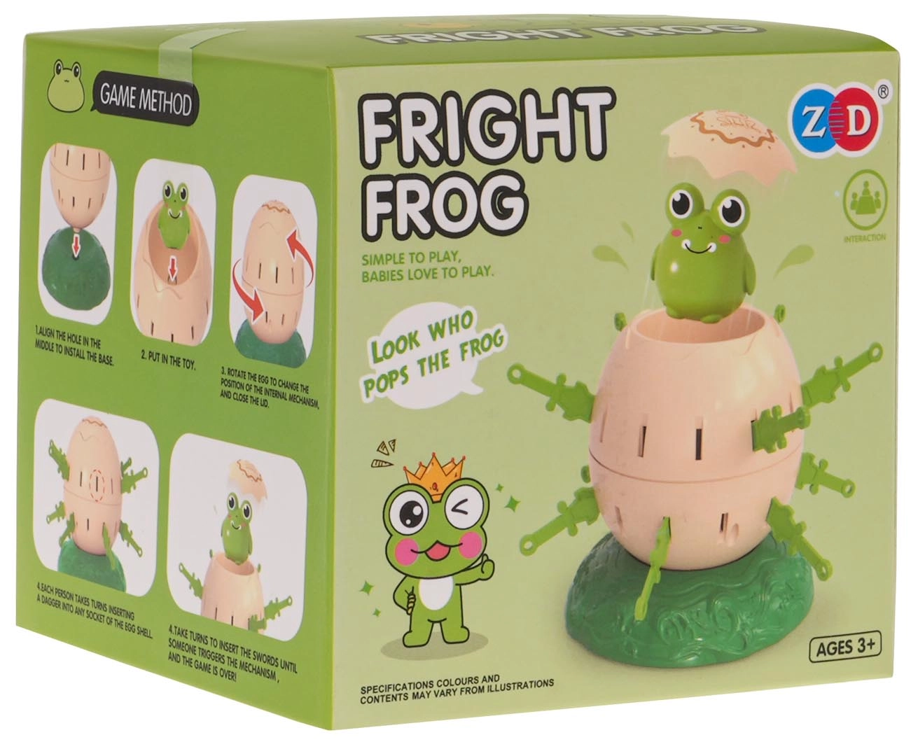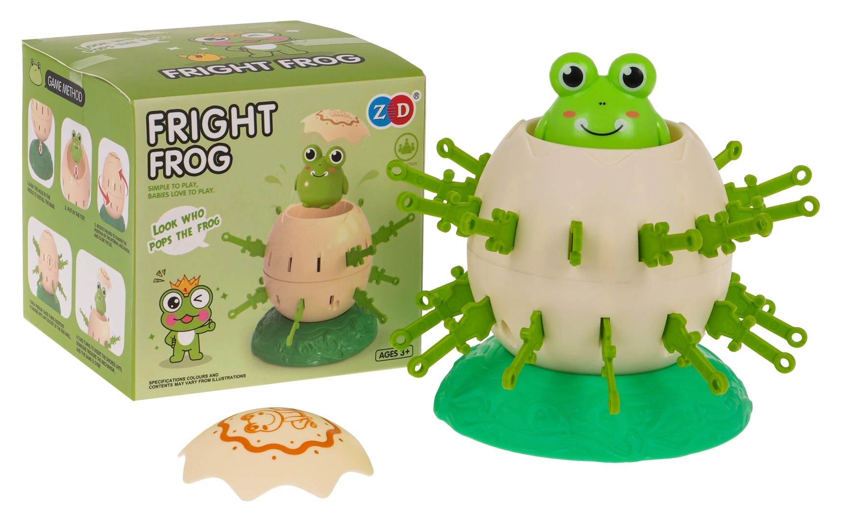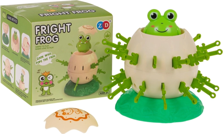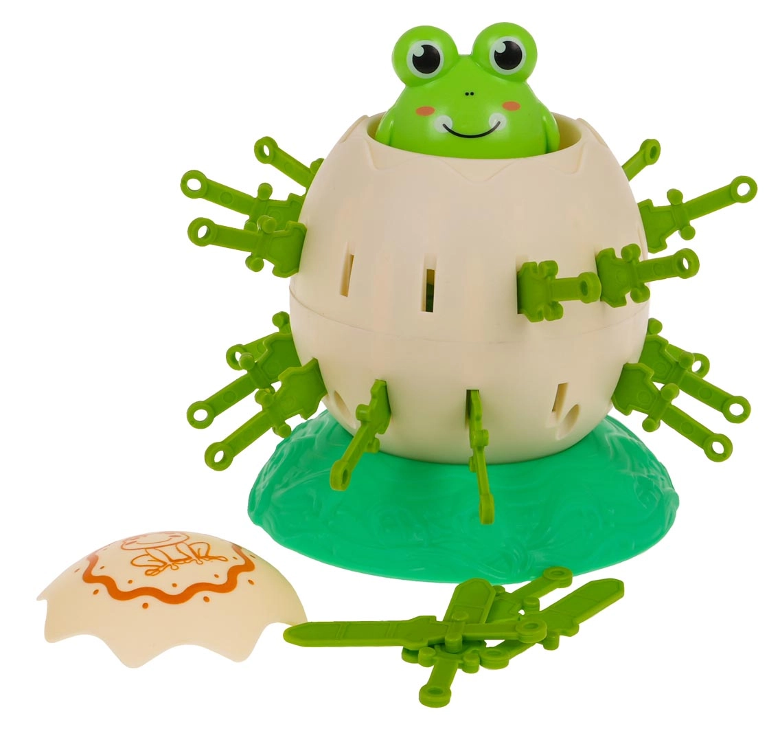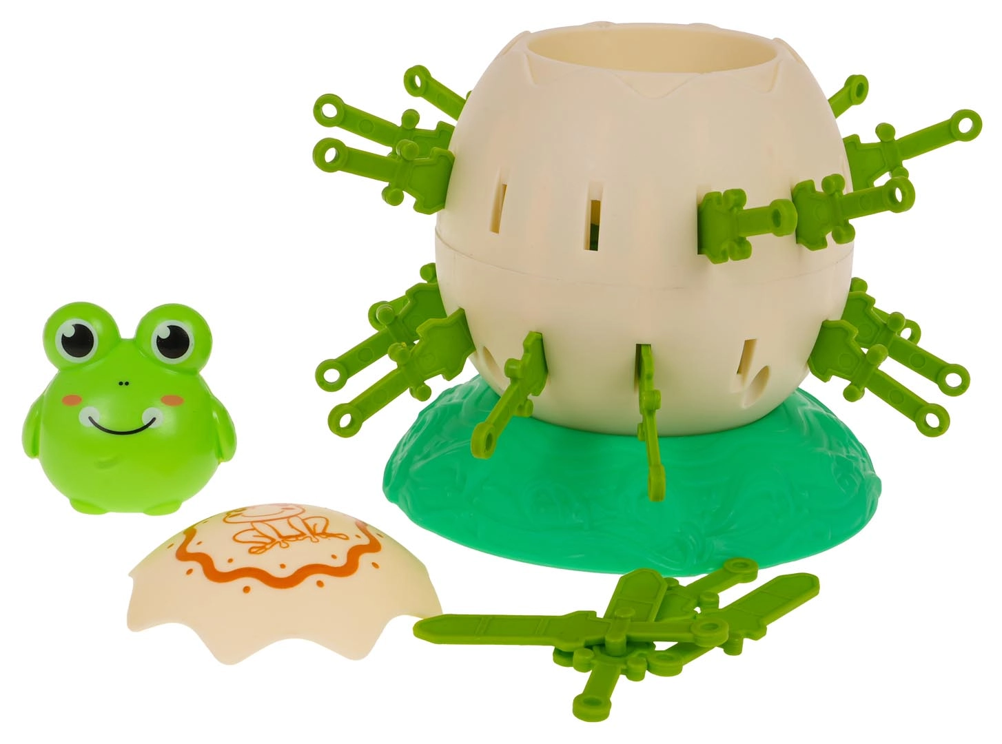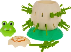 Zet het eitje op de standaard, verstop de kikker erin en maak de stokjes klaar. Spelers steken om de beurt stokjes in de openingen van het ei – maar pas op dat je de kikker niet raakt! Wanneer je het mechanisme activeert, kan de kikker onverwacht wegspringen als uit een katapult.
