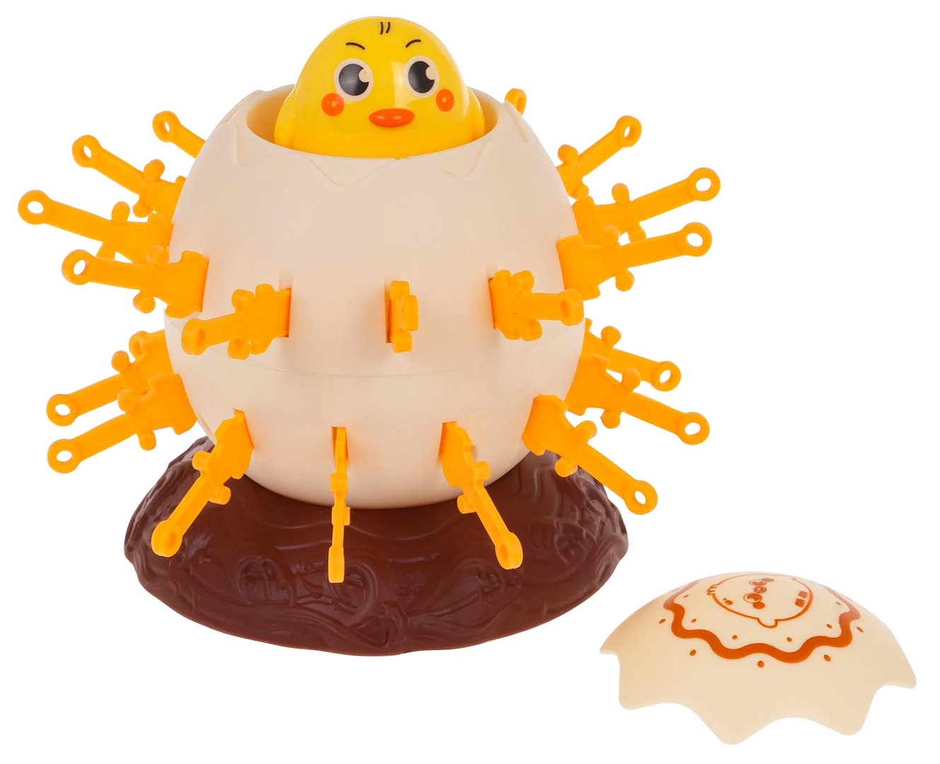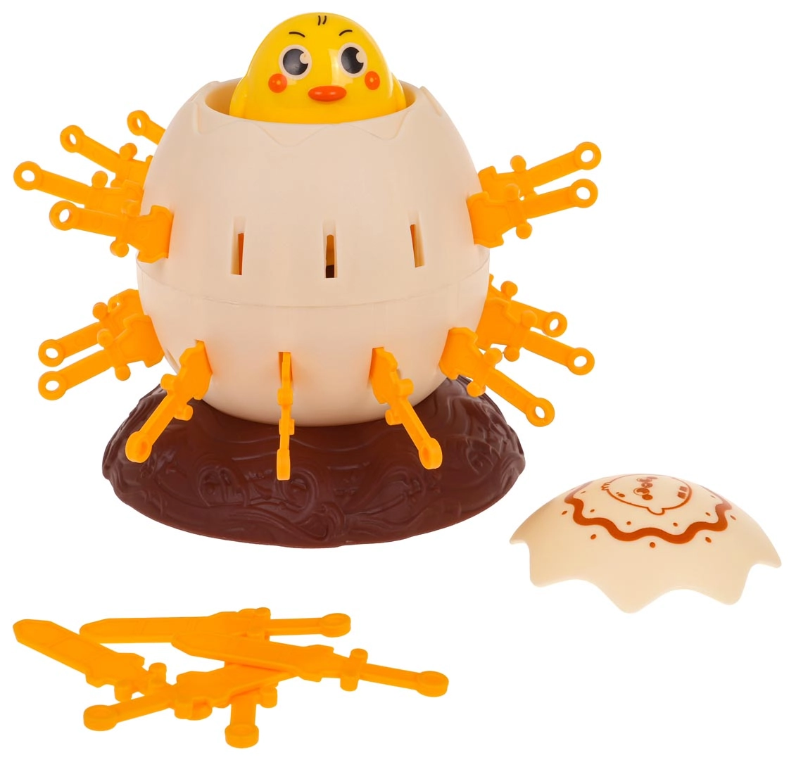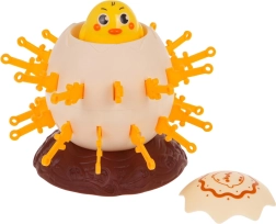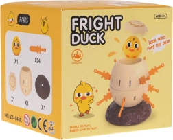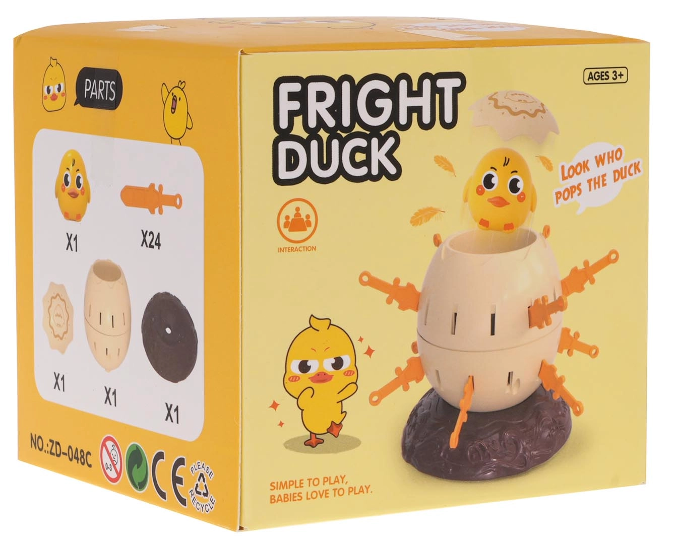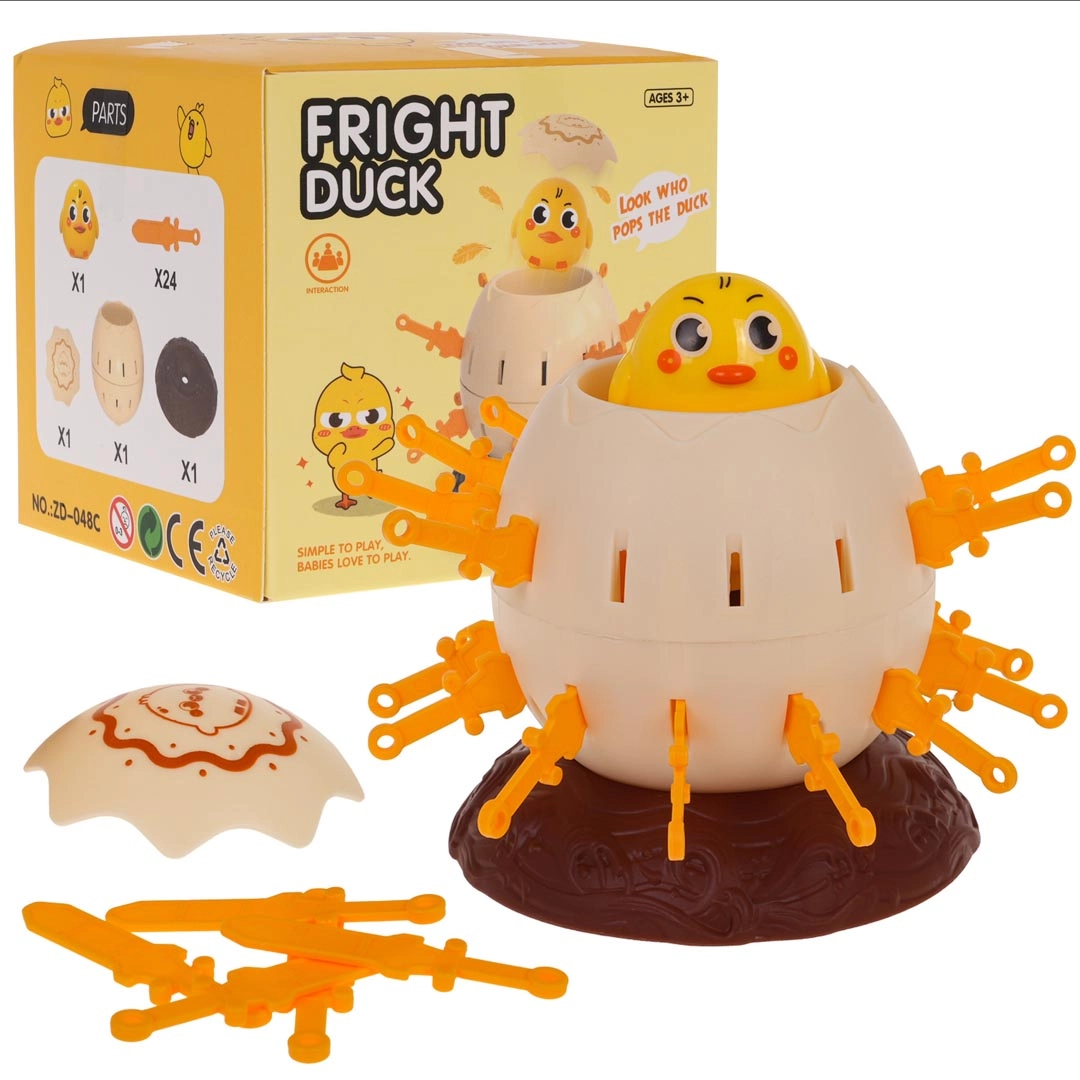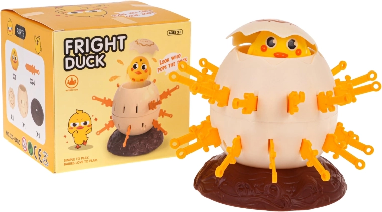 Plaats het ei met de eend op de voet, activeer het mechanisme en schuif om de beurt de zwaarden in de openingen. Wie als eerste al zijn zwaarden plaatst zonder de eend te raken, wint. Let op – als je de eend raakt, springt hij uit het ei als uit een katapult!