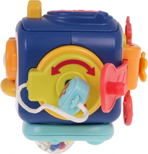 De kubus is ontworpen om de fijne motoriek en zintuiglijke waarneming te ontwikkelen. Hij is gemaakt van kunststof en bevat diverse interactieve elementen.