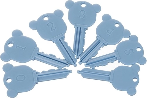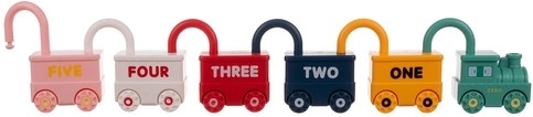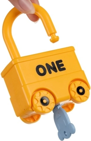 Een kleurrijke set van zes voertuigen en een locomotief in de vorm van slotjes met sleutels leert kinderen de cijfers 0–5 en kleuren. Veilig ABS-plastic, gladde afgeronde randen, unieke genummerde... Meer tonen