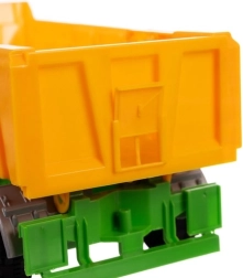 De aanhanger met hydraulisch kipmechanisme kiept de lading eenvoudig. De openende achterklep en de schuiflade maken het mogelijk om de inhoud in kleinere porties te lossen, terwijl de voorste steunpoot de aanhanger stabiliseert tijdens het kippen. Gladde oppervlakken van ABS-kunststof zijn snel schoon te maken met een vochtige doek, zodat het spel elke dag door kan gaan.