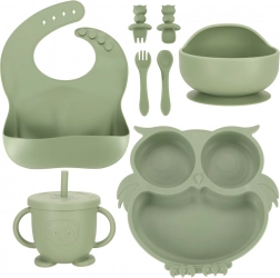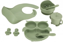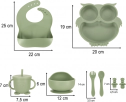 Praktische en aantrekkelijke siliconen serviesset voor kinderen. Bevat alles wat je kind nodig heeft voor comfortabel en leuk tafelen. Het uilenmotief in legergroene kleur is niet alleen modieus, maar zal ook elke kleine eter aanspreken.