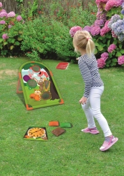 - Standaard met frame en 4 genummerde openingen met net; 4 gekleurde zakjes; lotbord met opdrachten; 4 stabilisatiepads; handleiding