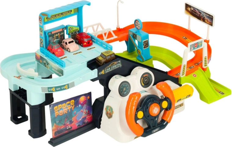 De set bevat een stuurwiel dat kinderen laat voelen alsof ze in een echte auto zitten, met drie knoppen om geluidseffecten te activeren, die het spel verrijken. Het stuur activeert ook één van de twee liften, waarmee de auto's naar de top van de baan worden gebracht.