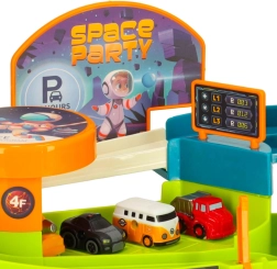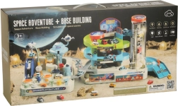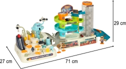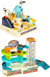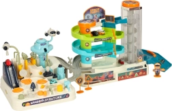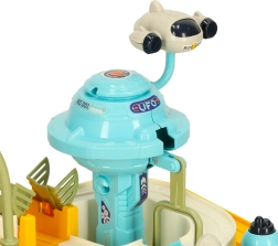 De multifunctionele kosmische racebaan biedt dubbele opwinding en speelmogelijkheden. Dankzij de twee routes kan men twee kleinere circuits maken of ze verbinden tot één grote baan en kijken hoe de kleine autootjes door het kosmische landschap suizen. De grote baan is uitgerust met een elektrische lift die de autootjes automatisch naar de top vervoert, wat ononderbroken plezier garandeert. Het kleinere parcours bevat interactieve elementen die het kind zelf moet bedienen, wat de manuele vaardigheden engageert en ontwikkelt. De set bevat zes voertuigen, inclusief een politievoertuig en een betonmixer, wat een diverse spelspeelervaring biedt.