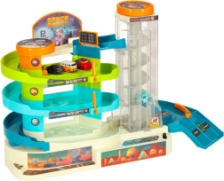 Kinderen kunnen zien hoe de autootjes over de baan rijden met behulp van een elektrische lift en kronkelige wegen, wat de visuele ontwikkeling stimuleert.