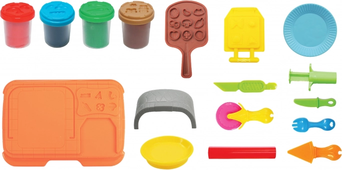 - Oven met vormpjes, voorbereidingsgereedschap, vormgereedschap, pizzaschep, 4 potjes boetseerklei