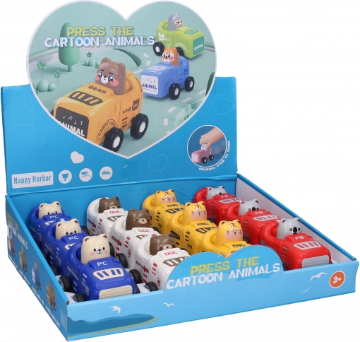 Schattig opwind diertje in autootje 9 cm. Drukken en rijden! 4 kleuren, ideaal cadeau voor kinderen en leuk voor onderweg. Verpakking displaybox 12 stuks.