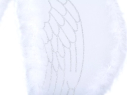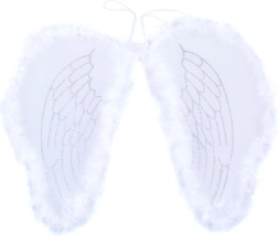 Witte vleugels met zilveren versieringen en een harige rand geven een magische uitstraling.
