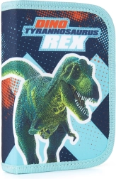 Onderdeel is een gymsack met trekkoorden en een etui met één laag, twee binnenflappen en elastische lusjes. Kinderen waarderen het uniforme T‑Rex‑motief en de praktische indeling.