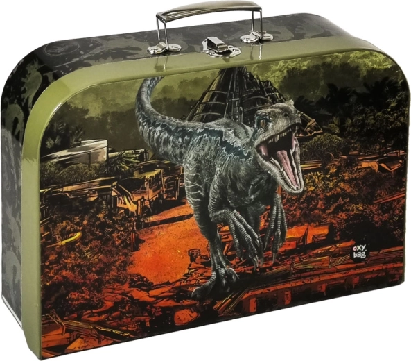Stijlvol kinderkoffertje JURASSIC WORLD van OXYBAG, ideaal voor knutselspullen, speelgoed en kleine schatten. Gemaakt van gelamineerd karton, sluit met een metalen clip, biedt plaats aan A4-formaat en is eenvoudig te onderhouden met een vochtige doek.