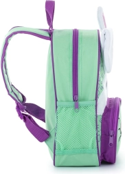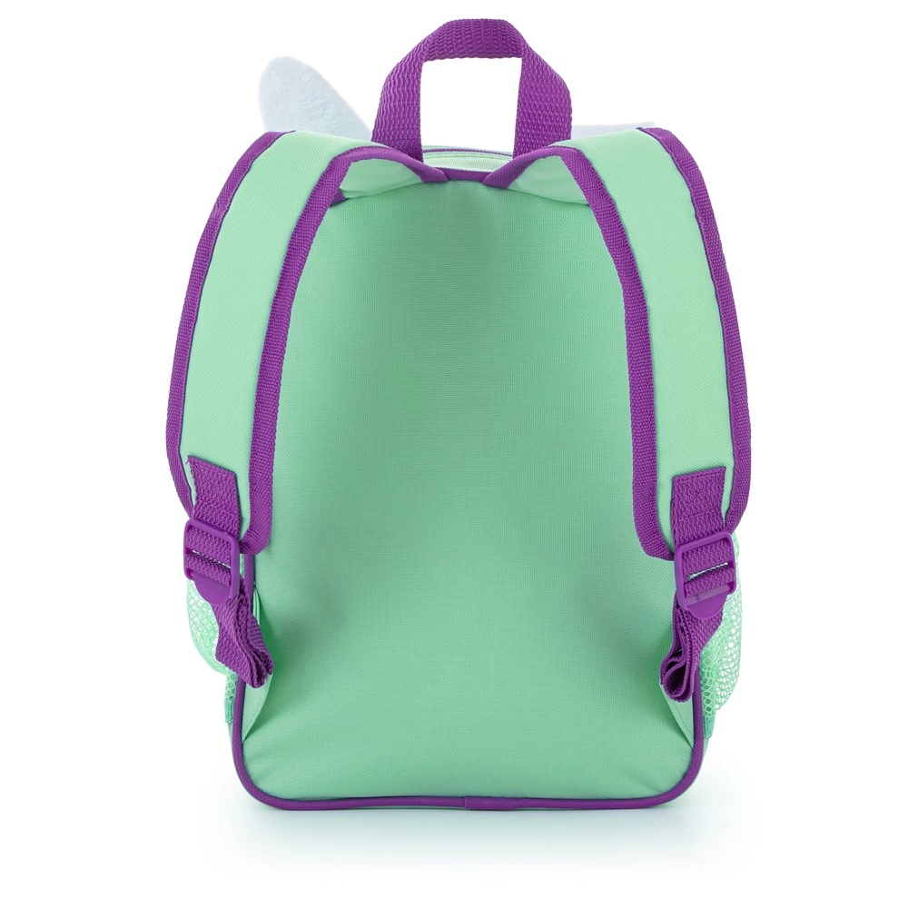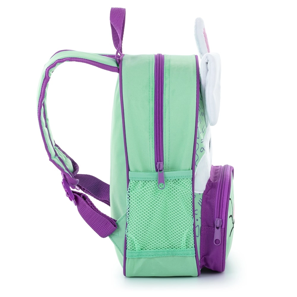 De praktische indeling helpt bij het organiseren: een hoofdvak voor grotere spullen, een voorvak voor een tussendoortje en mesh zijvakken voor een drinkfles. Verstelbare banden en zachte padding zorgen voor comfort bij dagelijks gebruik, terwijl het speelse konijnenmotief de verbeelding prikkelt.