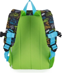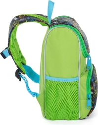 Lichte en comfortabele kinderrugzak met dinosaurusmotief voor dagelijks gebruik. Ideaal voor kinderen van 3 tot 6 jaar, met een ruim hoofdvak, een voorvak voor een tussendoortje en een zijvak voor een fles. Voor de veiligheid zijn er reflecterende elementen en voor draagcomfort een borstriem.