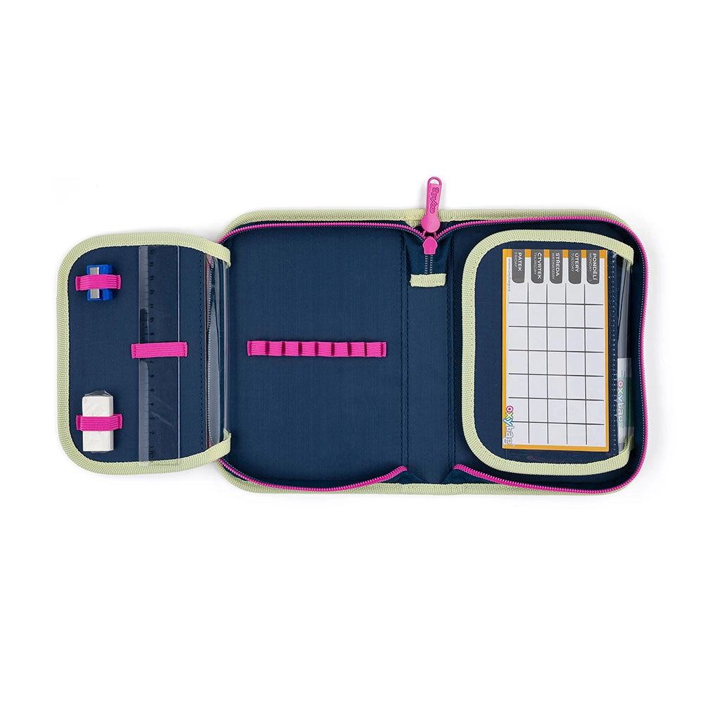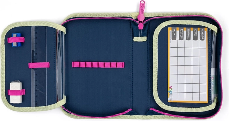 Eenetage-etui met twee binnenkleppen zorgt voor uitstekende organisatie van schoolspullen. Dankzij 25 elastische banden heb je potloden, pennen, gum en liniaal altijd op hun plaats. De transparante hoesjes op de kleppen zijn ideaal voor het lesrooster of notities.