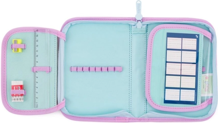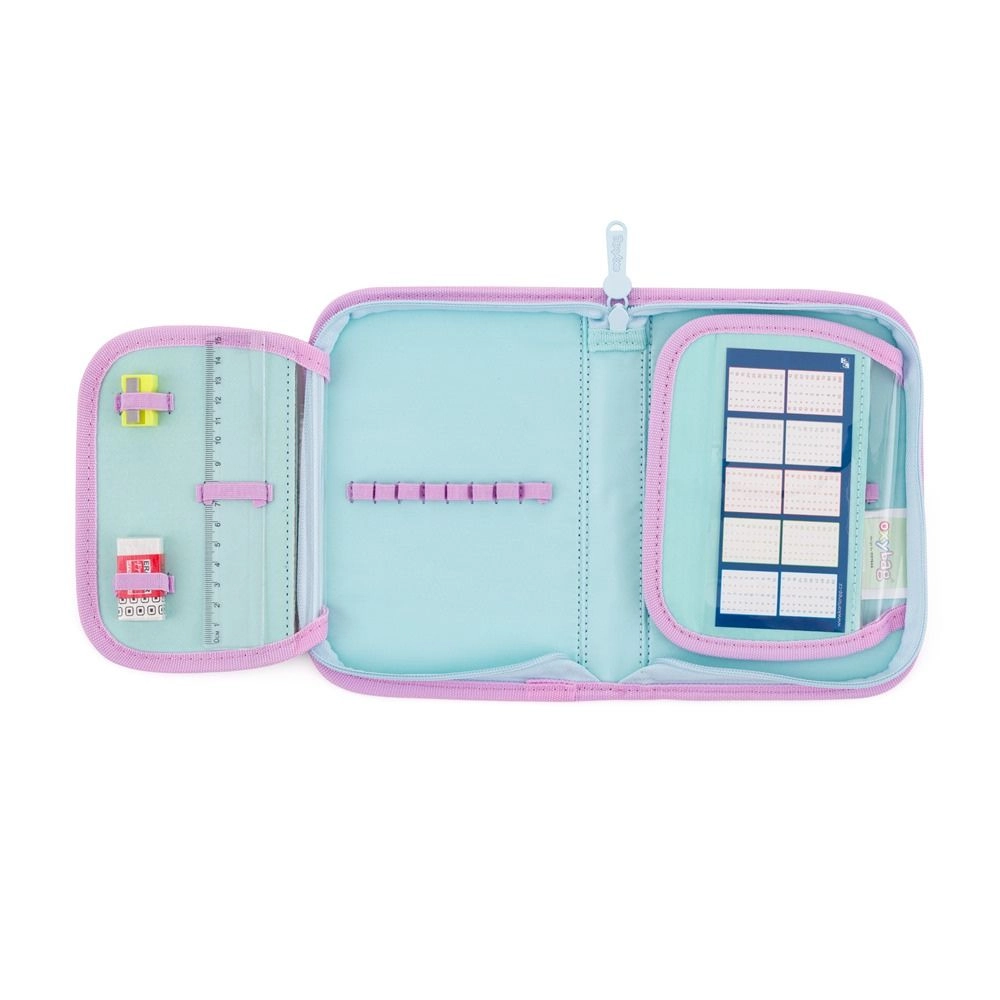 Een eenlaagse schooletui met 2 kleppen, leeg, bevat 25 elastische lussen voor het bevestigen van schrijfgerei. Op de binnenkleppen zitten transparante hoesjes voor het lesrooster.