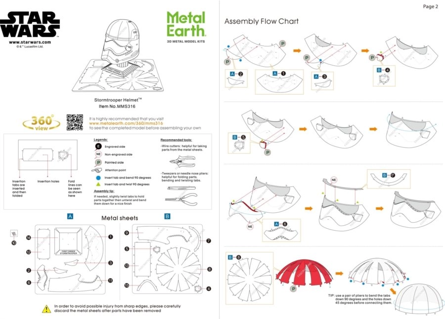 Haal de afzonderlijke onderdelen uit de metalen plaatjes; gebruik indien nodig een kleine zijkniptang (niet inbegrepen). De onderdelen worden met elkaar verbonden via vergrendelingen bestaande uit een lipje en een opening. Buig het lipje om met een kleine, smalle tang (niet inbegrepen) en verbind stap voor stap alle vergrendelingen tot er een zeer realistisch meesterwerk ontstaat!