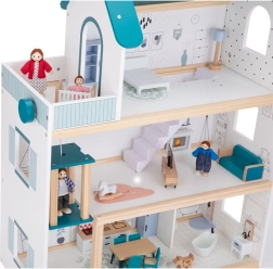 Het poppenhuis is uitgerust met meerdere kamers en een functionele lift, wat kinderen een realistische en verrijkende ervaring biedt.