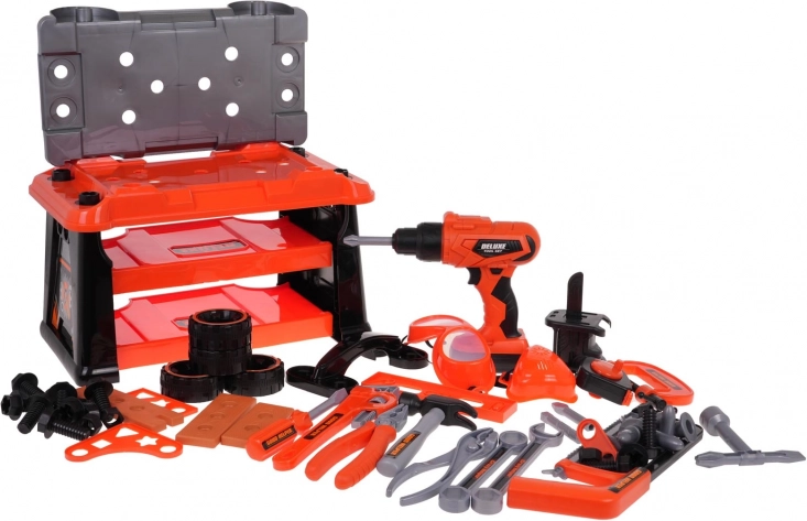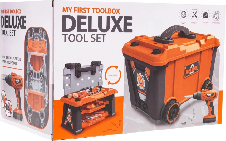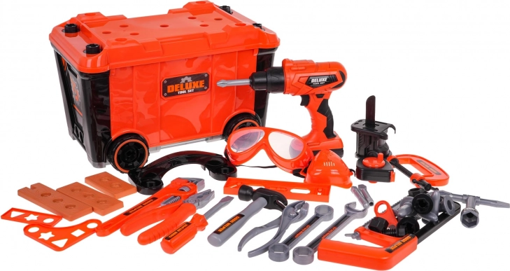 - koffer-werkplaats, .schroevendraaier, .- schroefbit-houder, .- 3 x verwisselbare bit, .- boor met elektrische zaag, - hamer, - platte schroevendraaier, .- ringsleutel en steeksleutel, .- sleutel, - sleutel, - veiligheidsbril, .- veiligheidsmasker, .- maatbeker, - houtzaag, .- tang, - handzaag, .- klem. - meetlint, - 4 wieltjes voor de koffer, .- 3 schroefbare componenten, .- schroeven, - bouten, .- moeren. |